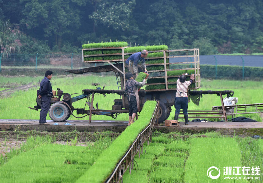 6月4日,武義縣一育秧工廠員工忙著為訂單農(nóng)戶起運(yùn)單季稻秧苗。隨著“芒種”節(jié)氣的到來,武義縣農(nóng)民搶抓有利時(shí)機(jī),加快翻耕平整水田,搶種單季水稻。(浙江在線拍友 張建成 攝)