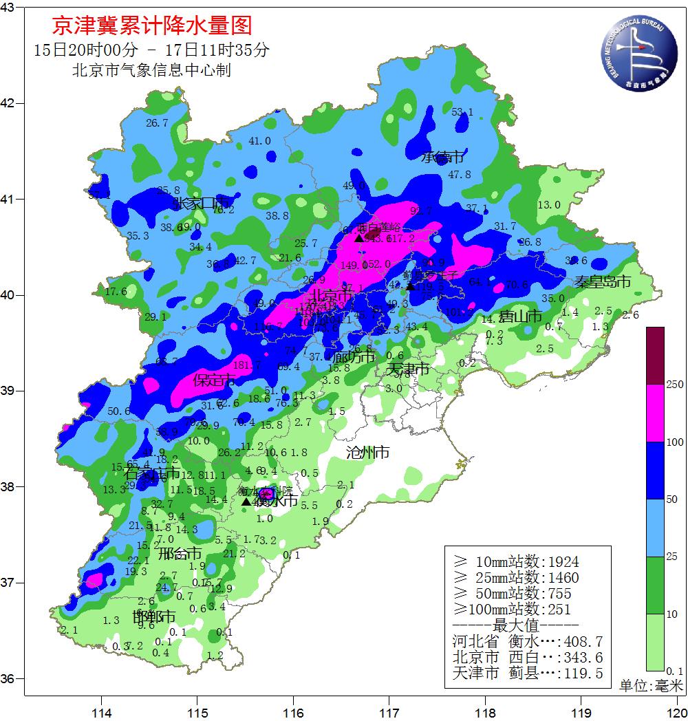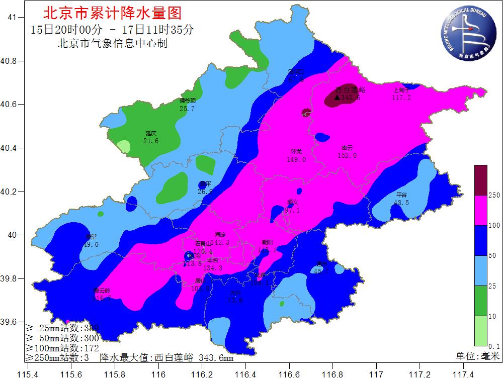 根據(jù)氣象觀測,15日20時至17日8時,北京市平均降水量達77.7毫米,城區(qū)平均100.9毫米,全市453個氣象觀測站中有121個超過100毫米、12個超過200毫米。其中,密云有2個測站超過300毫米,分別是西白蓮峪達(336毫米)和捧河巖村(302毫米)。