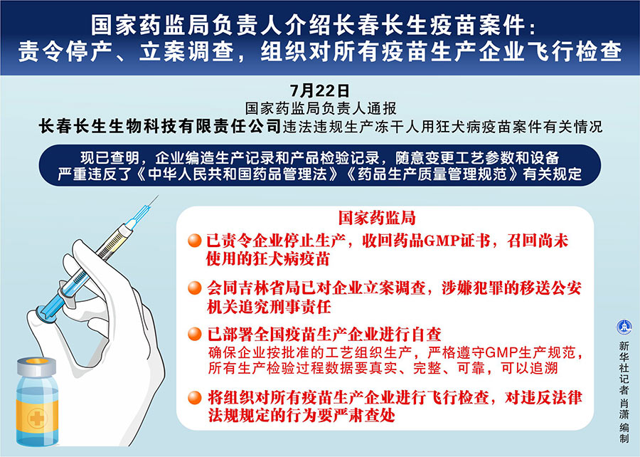 這位負(fù)責(zé)人說,根據(jù)舉報(bào)提供的線索,7月5日,國家藥監(jiān)局會(huì)同吉林省局對(duì)長(zhǎng)春長(zhǎng)生公司進(jìn)行飛行檢查;7月15日,國家藥監(jiān)局會(huì)同吉林省局組成調(diào)查組進(jìn)駐企業(yè)全面開展調(diào)查。7月15日,國家藥監(jiān)局發(fā)布了《關(guān)于長(zhǎng)春長(zhǎng)生生物科技有限責(zé)任公司違法違規(guī)生產(chǎn)凍干人用狂犬病疫苗的通告》。