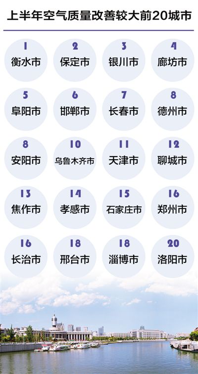 今年上半年,169個城市中,臨汾、石家莊、邢臺等20個城市空氣質量相對較差;???、黃山、拉薩等20個城市空氣質量相對較好。與去年同期相比,169個城市中,衡水、保定、銀川等20個城市空氣質量改善幅度相對較好;常州、西寧、嘉興等20個城市空氣質量改善幅度相對較差。