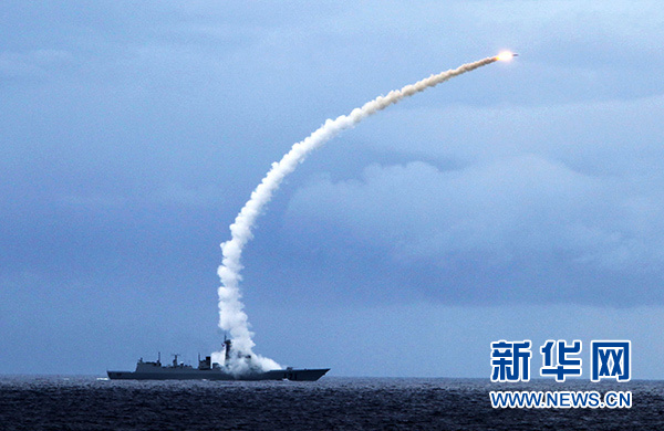 海口艦在實(shí)彈演習(xí)中發(fā)射艦空導(dǎo)彈攔截來襲目標(biāo)(2010年7月26日攝)。 新華社發(fā)