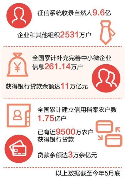 目前中國(guó)人民銀行的征信系統(tǒng)已建設(shè)成為國(guó)內(nèi)規(guī)模最大、收集信用信息最全、覆蓋范圍和使用最廣的信用信息基礎(chǔ)數(shù)據(jù)庫(kù)。數(shù)據(jù)顯示,截至今年5月底,征信系統(tǒng)收錄自然人9.6億,企業(yè)和其他組織2531萬(wàn)戶(hù)。