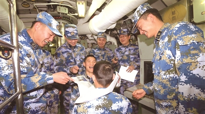 某潛艇支隊(duì)立足“百人同操一桿槍的現(xiàn)實(shí)”,堅(jiān)持踐行群眾路線、密切聯(lián)系官兵。圖為該支隊(duì)某艇員隊(duì)副政委徐建鵬和戰(zhàn)士們一起開(kāi)展“龍宮游戲”,以緩解深海長(zhǎng)航帶來(lái)的巨大心理壓力,為艇員們保持良好備戰(zhàn)狀態(tài)增添動(dòng)力。茆 琳攝