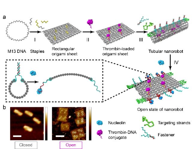 該團(tuán)隊的丁寶全研究員通過精準(zhǔn)控制,將一種包含7000多個堿基的噬菌體的DNA單鏈分子折成長方形板,放上四個“殺手”——凝血酶分子,然后再將其卷起來,接口處安裝用核仁素DNA片段做的“鎖”,最終形成90納米長、直徑為19納米的管狀機(jī)器人。