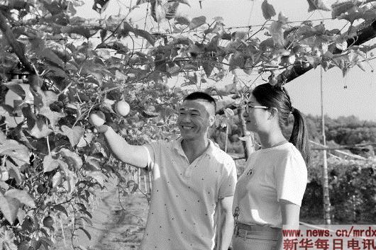 武平縣返鄉(xiāng)創(chuàng)業(yè)大學生王秀珍(右)與合作種植的果農(nóng)一起查看百香果的生長情況。(本報記者郭圻攝)