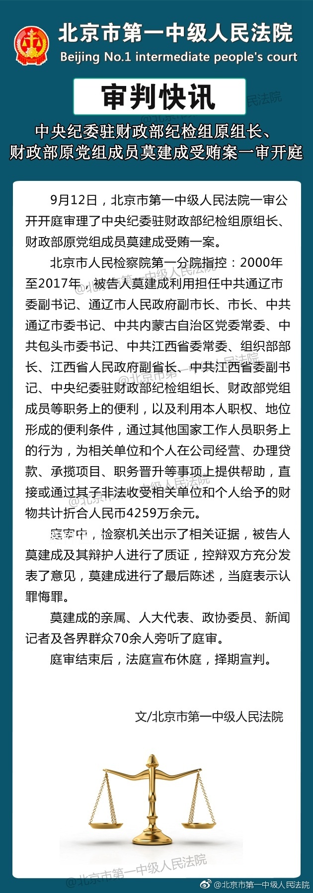 中央紀委駐財政部紀檢組原組長、財政部原黨組成員莫建成嚴重違紀被開除黨籍和公職