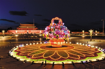 9月23日凌晨,天安門廣場(chǎng)高達(dá)17米的“祝福祖國”巨型花籃完工,正式與游客見面。除了天安門廣場(chǎng),長(zhǎng)安街沿線建國門至復(fù)興門的10處花壇,也為節(jié)日的北京增添喜慶。