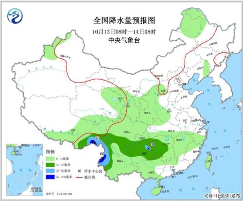 10月13日08時(shí)至14日08時(shí),內(nèi)蒙古東北部、黑龍江西北部、青藏高原東部等地有小雨(雪)或雨夾雪;遼寧東部、西北地區(qū)東部、山西中西部、河南西部、江漢北部和南部、江南大部、西南地區(qū)、華南北部和西部、海南島和臺(tái)灣島等地部分地區(qū)有小到中雨,其中,西藏東南部、貴州東北部和云南西部等地局地有大雨或暴雨(50~70毫米)。