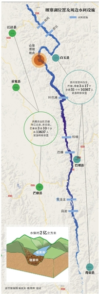 據范曉介紹,金沙江堰塞湖的山體滑坡處在西藏的峽谷一帶,地差比較大,兩岸陡峭,且因巖石構造原因,該地帶是山體滑坡崩塌高發(fā)地。而這次金沙江堰塞湖的形成,主要是滑坡土量達約2500萬立方米,進而把河道堵塞形成堰塞體,堰塞體堵截河道形成堰塞湖。