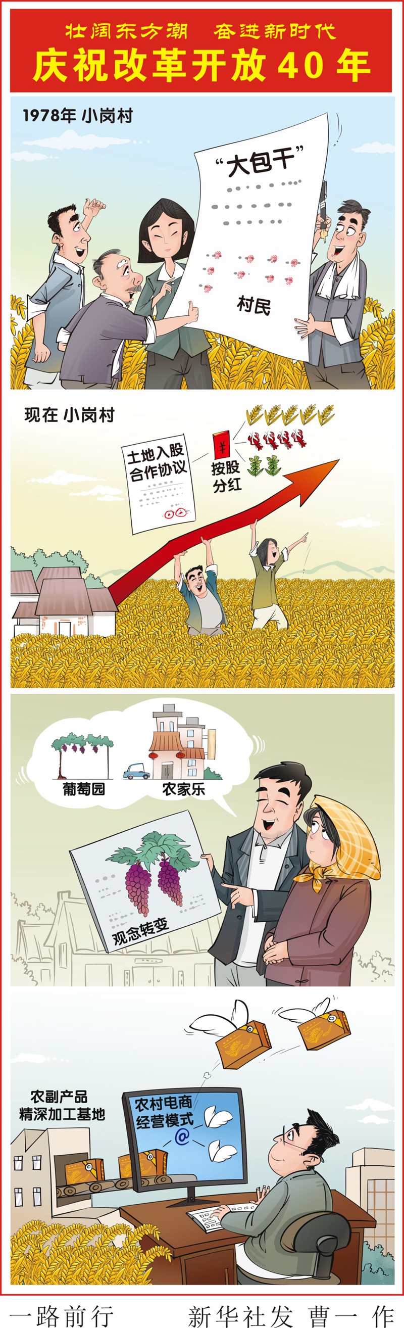 1978年的小崗村,18位村民按下了分田到戶的紅手印,“大包干”拉開(kāi)了中國(guó)農(nóng)村改革的大幕。40年后的小崗村,正在開(kāi)展農(nóng)村集體產(chǎn)權(quán)制度改革,土地入股讓農(nóng)民變股東;葡萄園里開(kāi)起了農(nóng)家樂(lè),對(duì)農(nóng)副產(chǎn)品進(jìn)行精深加工,電商經(jīng)營(yíng)模式助力產(chǎn)品打開(kāi)銷路,觀念的轉(zhuǎn)變讓小崗村里的農(nóng)民不再僅僅種著一畝三分地。