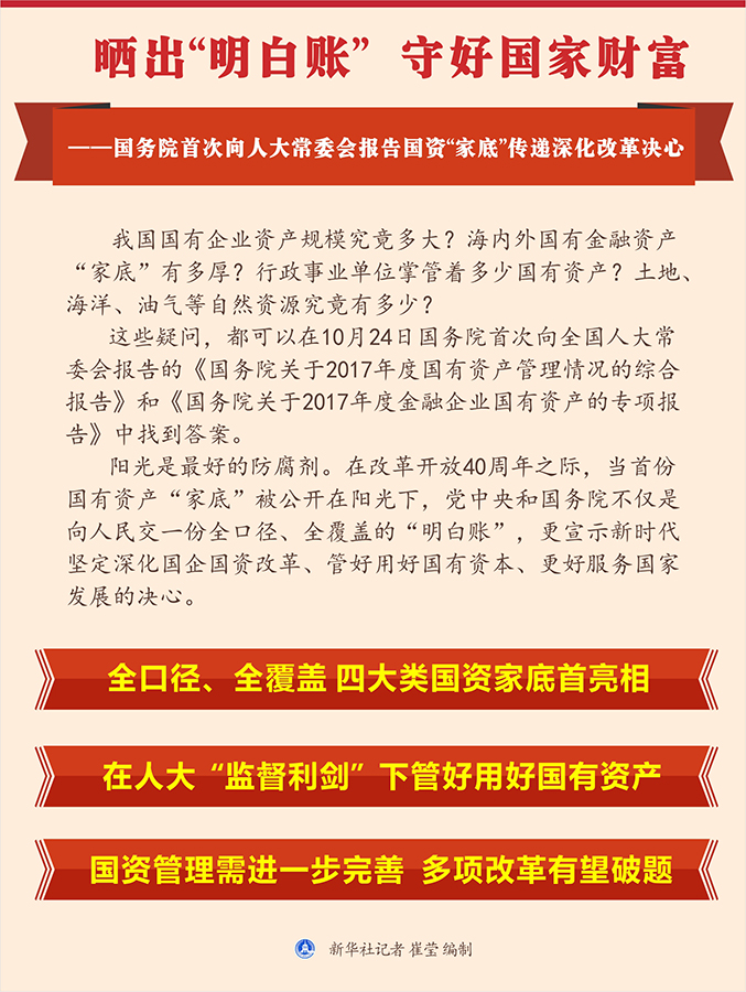 ?。玻慈?,國(guó)務(wù)院向全國(guó)人大常委會(huì)首次報(bào)告了國(guó)有資產(chǎn)管理情況,這份全口徑的國(guó)有資產(chǎn)綜合報(bào)告彰顯公開(kāi)決心: