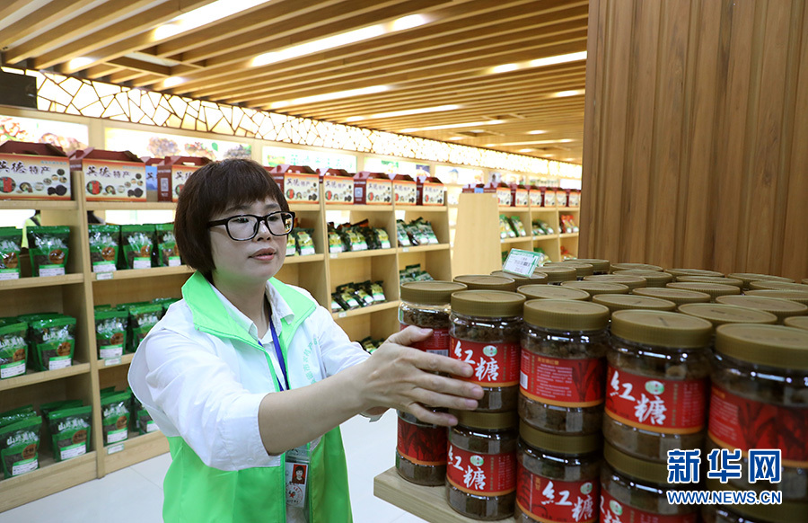 在英德市電子商務(wù)產(chǎn)業(yè)園,農(nóng)特產(chǎn)品o2o體驗館的工作人員將本地電商企業(yè)生產(chǎn)的紅糖商品上架展銷(10月24日攝)。新華社記者王瑞平攝