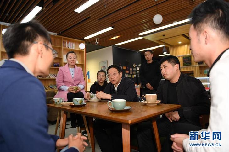 延安市市長薛占海(中)在延安新區(qū)898創(chuàng)新空間與青年創(chuàng)業(yè)者交流(10月16日攝)。 新華社記者 李一博 攝