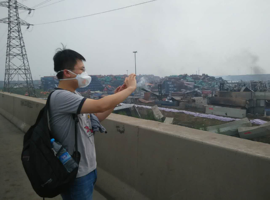 圖為2015年8月,李鯤在天津港“8·12”特大火災(zāi)爆炸事故現(xiàn)場(chǎng)附近拍照記錄現(xiàn)場(chǎng)情況。