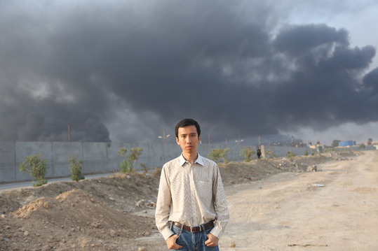 2016年11月10日劉萬(wàn)利在伊拉克摩蘇爾市南部地區(qū)采訪(fǎng)。