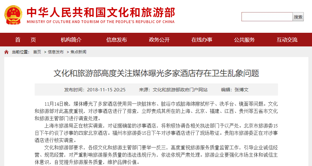回應(yīng)稱,11月14日晚,媒體曝光了多家酒店使用同一塊臟抹布、臟浴巾或臟海綿擦拭杯子、洗手臺、鏡面等問題。文化和旅游部對此高度重視,對涉事酒店進(jìn)行了排查,立即責(zé)成其所在的上海、北京、福建、江西、貴州等五省市文化和旅游主管部門進(jìn)行調(diào)查處理。
