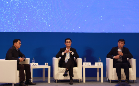 第五屆世界互聯(lián)網(wǎng)大會企業(yè)家高峰對話分論壇,高瓴資本張磊(左)、騰訊馬化騰(中)、百度李彥宏(右)