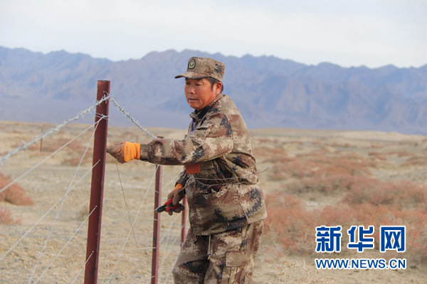 在新疆哈密市七角井鎮(zhèn)七角井村的老村附近,趙金閃在修復荒漠林圍欄(11月2日攝)。新華社記者孫哲攝