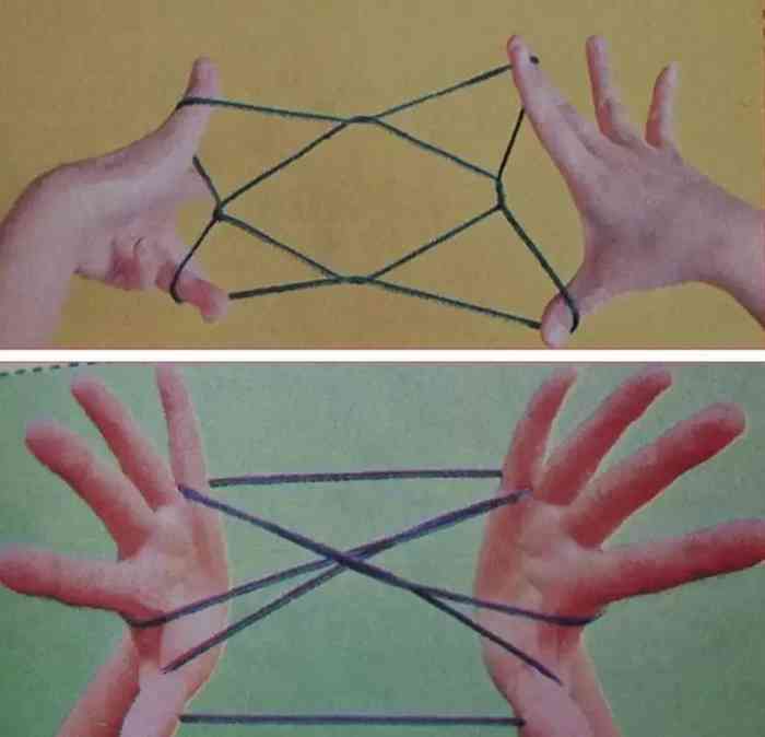 用一根繩子結(jié)成繩套,一人以手指編成一種花樣,另一人用手指接過來,翻成另一種花樣,相互交替編翻,直到一方不能再編翻下去為止。這個游戲最大的樂趣在于翻出新花樣,展現(xiàn)自己的聰明才智。
