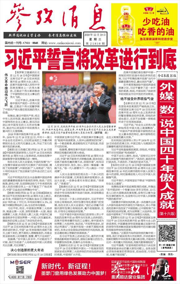 《參考消息》頭版報道改革開放40周年紀念大會 彩版