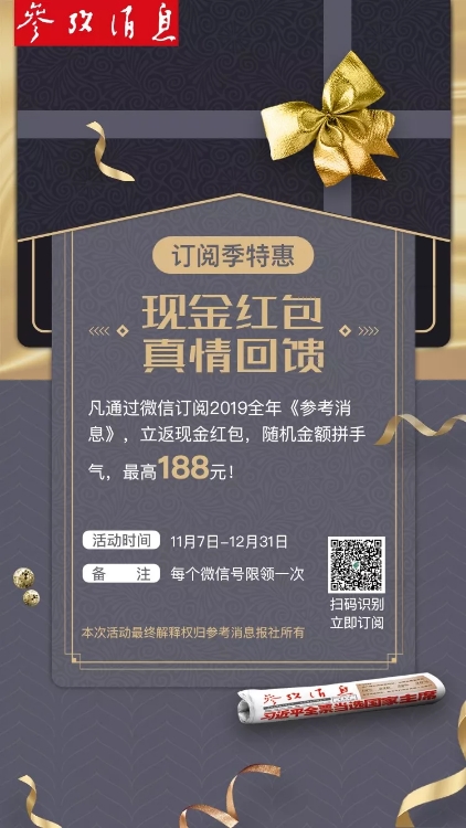 凡通過微信訂閱2019全年《參考消息》,立返現(xiàn)金紅包,隨機金額拼手氣,最高188元!