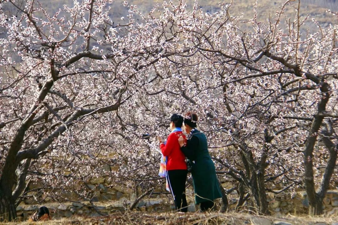 2018-03-20,山東鄒平。春天,杏花開(kāi)放,游人在杏園里賞花自拍。作者:王敏南