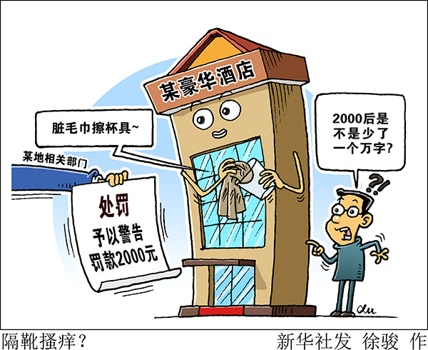 2018年11月,國(guó)內(nèi)十幾家高端酒店連續(xù)曝出衛(wèi)生亂象。近日上海相關(guān)部門對(duì)涉事酒店分別處以警告、罰款2000元的處罰,引發(fā)網(wǎng)友熱議:被罰金額甚至抵不上有的酒店單間一晚房?jī)r(jià)。業(yè)界呼吁,“亮劍”酒店亂象還需“劍更鋒利”。