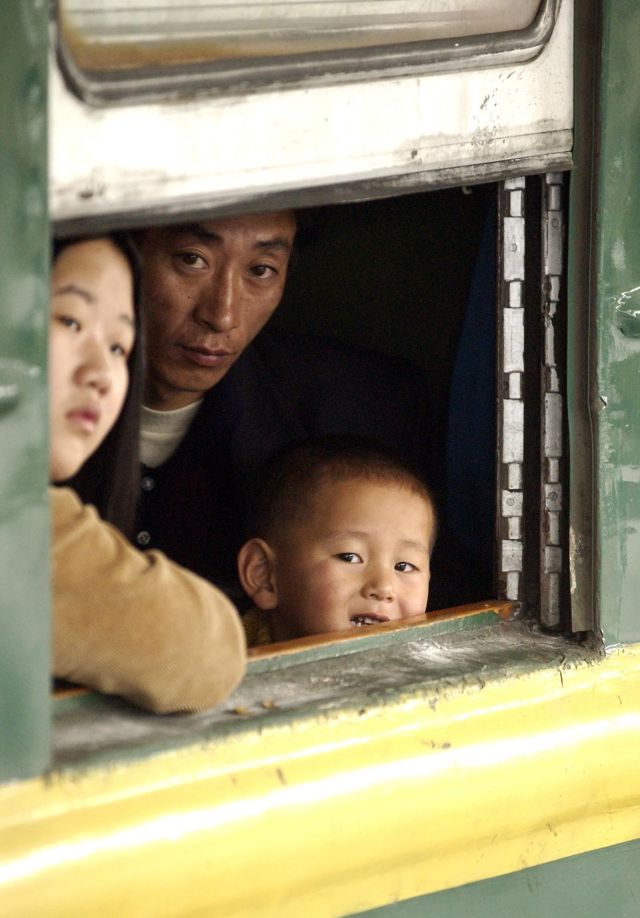 2004年,在廣州火車(chē)站登上返鄉(xiāng)列車(chē)的乘客通過(guò)車(chē)窗向外張望。