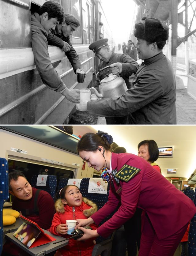 上圖:1984年春節(jié)期間,在石家莊火車(chē)站,工作人員為過(guò)往旅客送開(kāi)水。(新華社記者 趙連升 攝);下圖:2016年,南昌鐵路局福州客運(yùn)段列車(chē)工作人員廖輝為一名小乘客送去熱水。(新華社記者 姜克紅 攝)