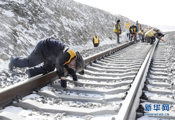 青藏鐵路格爾木工務段望昆線路養(yǎng)護車間副主任于本蕃(前)跪在鐵路上對已完成檢修的鐵軌進行復檢(1月11日攝)。 新華社發(fā)(王浡 攝)