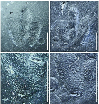 這些精致的小龍足跡一共有4個(gè),組成了一道行跡,仿佛跨越了1億年的時(shí)空遇到人類?!靶↓堊阚E僅在韓國和中國發(fā)現(xiàn),是東亞白堊紀(jì)的特有足跡。這是世界上第10處發(fā)現(xiàn)有小龍足跡的化石點(diǎn),也是首次發(fā)現(xiàn)這種足跡的皮膚印痕?!绷昼姁湼嬖V記者。此前,古生物學(xué)家從未發(fā)現(xiàn)過有如此完美的皮膚印痕,足跡上的鱗片痕跡平均直徑還不到0.4毫米,而且不同于此前的鱗片印痕僅出現(xiàn)在足跡的部分區(qū)域,小龍足跡保存了整個(gè)腳底的皮膚。
