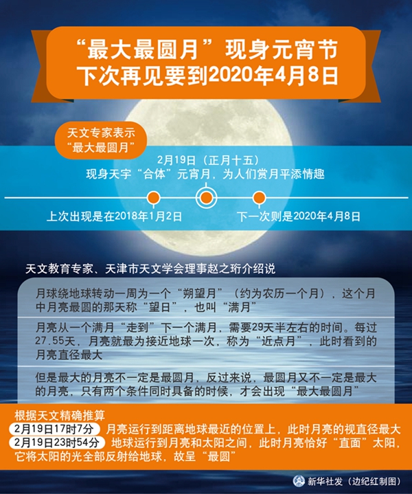 新華社天津2月19日電(記者周潤(rùn)?。┠甓取白畲笞顖A月”19日(正月十五)現(xiàn)身天宇“合體”元宵月,為人們賞月平添情趣。天文專(zhuān)家表示,“最大最圓月”上次出現(xiàn)是在2018年1月2日,下一次則是2020年4月8日。