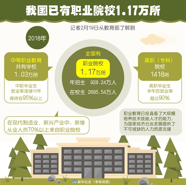 新華社北京2月19日電(記者胡浩)記者19日從教育部了解到,2018年,全國有職業(yè)院校1.17萬所,年招生928.24萬人,在校生2685.54萬人。職業(yè)教育已經(jīng)具備了大規(guī)模培養(yǎng)技術(shù)技能人才的能力,為國家經(jīng)濟(jì)社會(huì)發(fā)展提供了不可或缺的人力資源支撐。