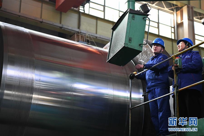 哈電集團(tuán)哈爾濱電機(jī)廠(chǎng)有限責(zé)任公司副總設(shè)計(jì)師王波(右)在企業(yè)的水電分廠(chǎng)了解生產(chǎn)情況(2月12日攝)。新華社記者 王建威 攝