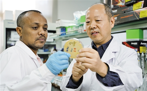 真菌學(xué)國(guó)家重點(diǎn)實(shí)驗(yàn)室的科研人員(右)在指導(dǎo)埃塞俄比亞留學(xué)生分離和鑒定酵母菌。 趙小平攝 (中經(jīng)視覺)