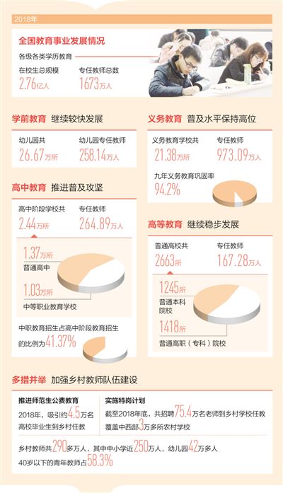 2018年,我國各級各類教育均取得較大成就。學(xué)前教育快速發(fā)展,九年義務(wù)教育繼續(xù)鞏固,大班額、超大班額大幅下降,絕大多數(shù)義務(wù)教育學(xué)校達(dá)到辦學(xué)底線要求,偏遠(yuǎn)山區(qū)教學(xué)點變得小而美、小而全,貧困地區(qū)教師隊伍煥發(fā)新活力,高考綜合改革試點各地因地制宜制定方案……教育改革發(fā)展的各項工作正蹄疾步穩(wěn)、有序推進(jìn)。