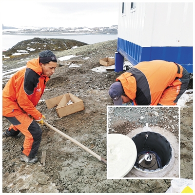 科考隊(duì)員挖掘觀測(cè)儀器安放坑。小圖為南極地震臺(tái)站觀測(cè)儀器安放坑。