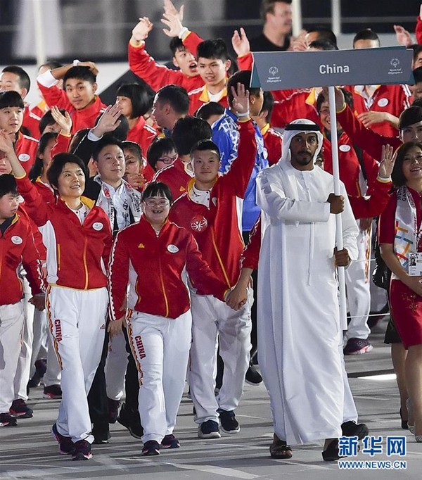 圖為3月14日,李想(中)與自己的偶像、前奧運(yùn)冠軍李小鵬(前排右五)隨中國代表團(tuán)在2019年阿布扎比夏季特奧會(huì)開幕式上入場。 新華社記者 夏一方 攝