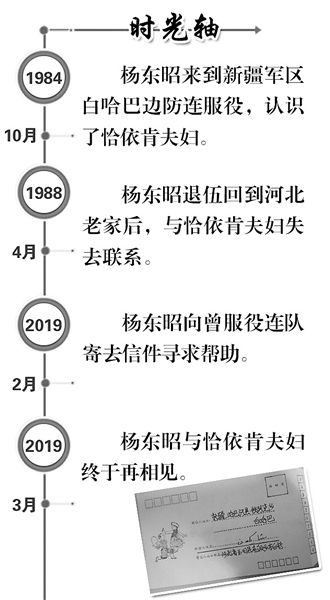 隨著時間的推移,楊東昭這個當(dāng)年20歲的小伙子如今已年過半百,雖然日子過得越來越紅火,但內(nèi)心對兩位哈薩克族老人的思念越發(fā)強(qiáng)烈。在千家萬戶團(tuán)聚歡樂的鞭炮聲中,他提筆寫了一封信寄到曾經(jīng)服役的連隊尋求幫助。