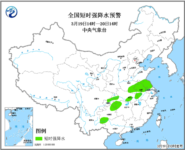 這次降雨過程中,會有明顯的雷電天氣。從19日夜間開始,河南南部、江蘇、安徽東北部、湖北北部、湖南西北部和貴州北部等地將先后出現(xiàn)雷電、短時強降水、雷暴大風和冰雹等強對流天氣。19日10時,中央氣象臺發(fā)布了強對流天氣藍色預警。