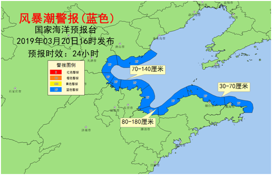 受冷空氣和出海氣旋的共同影響,預(yù)計(jì):3月20日傍晚到21日中午,渤海灣將出現(xiàn)70到140厘米的風(fēng)暴增水,萊州灣將出現(xiàn)80到180厘米的風(fēng)暴增水,山東半島北部沿海將出現(xiàn)30到70厘米的風(fēng)暴增水。上述岸段內(nèi)的天津塘沽、河北曹妃甸、黃驊和山東濱州港潮位站將于21日凌晨出現(xiàn)達(dá)到當(dāng)?shù)厮{(lán)色警戒潮位的高潮位。天津市、河北省唐山市、滄州市和山東省濱州市的風(fēng)暴潮預(yù)警級別為藍(lán)色。