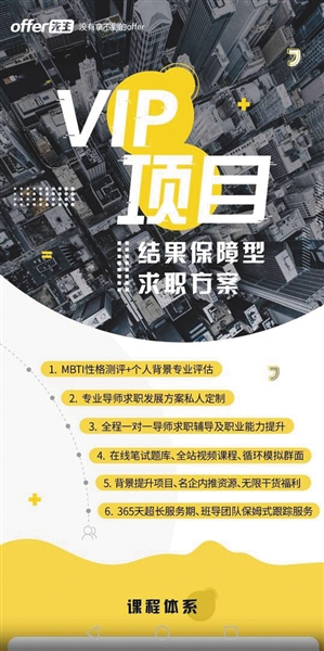 “該計劃分為6周,前4周時間內(nèi),由主講導(dǎo)師給大家講解這個項目的課題內(nèi)容及安排。后2周以實戰(zhàn)課專注項目報告的整合和產(chǎn)出為主,主要是整理產(chǎn)出報告的時間。最后也會有導(dǎo)師來教授如何包裝本段經(jīng)歷到簡歷上以及如何面試。”據(jù)其介紹,參與該計劃,即可獲得長達(dá)一年時間的服務(wù)周期,除了提供求職信息、輔導(dǎo),還可以優(yōu)先獲得內(nèi)推機(jī)會,在簽訂合同時,將會由offer先生與求職者簽訂合同,列出求職企業(yè)名單,該名單將包含“第一志愿”梯隊與“第二志愿”梯隊,offer先生將負(fù)責(zé)保證求職者在服務(wù)期限內(nèi)獲得offer。