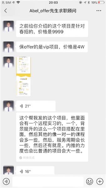 記者以春招求職學(xué)生身份與該助手取得了聯(lián)系,在詢問過記者的畢業(yè)學(xué)校、學(xué)習(xí)專業(yè)、求職意向后,這位助手推薦了一個針對2019年春招的項目,該項目顯示服務(wù)周期三個月,包含了10個導(dǎo)師輔導(dǎo)課程及在線求職精品課,與海量求職資料包、求職信息,以及團(tuán)隊中“1v1貼心陪伴”。而這項春招項目的標(biāo)價,高達(dá)8999至12999元。