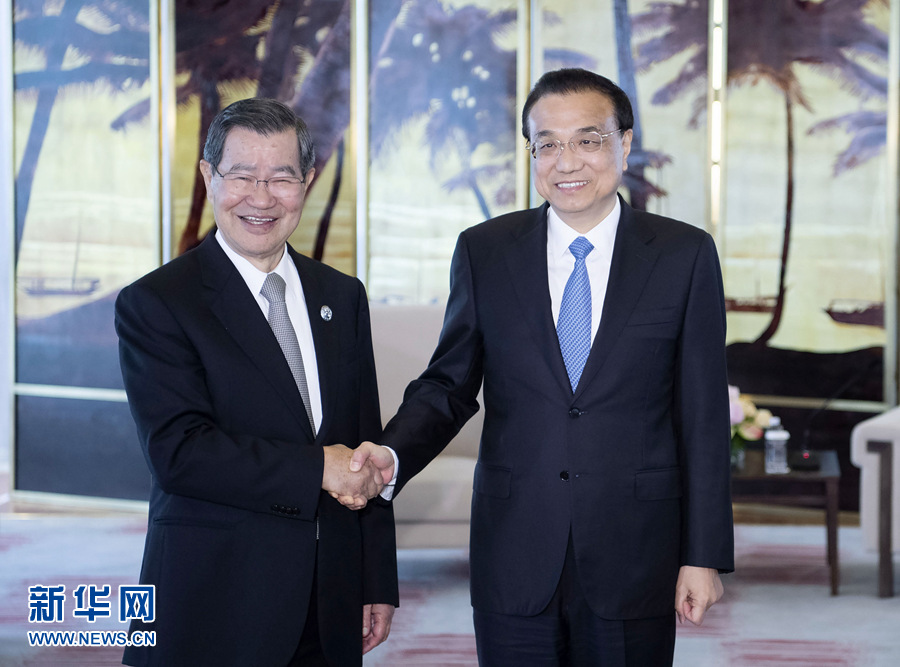 3月27日,國務院總理李克強在海南博鰲會見臺灣兩岸共同市場基金會榮譽董事長蕭萬長一行。 新華社記者 李濤 攝