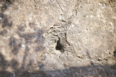 寶頂?shù)娜贤帘砻?,疑為盜墓人用鐵釬打下的探孔