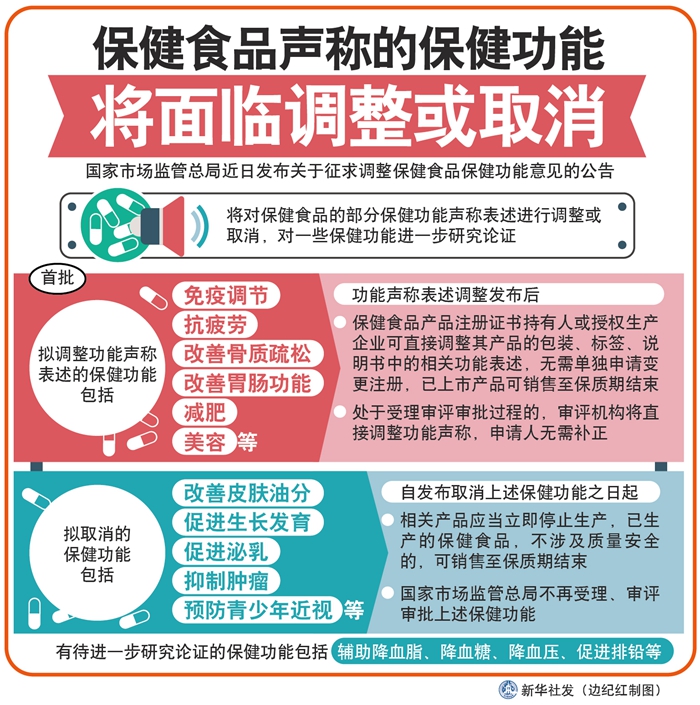 國家市場監(jiān)管總局在對不同歷史時期批準的保健功能進行梳理匯總的基礎上,組織醫(yī)學、藥學、食品、營養(yǎng)等領域?qū)<疫M行多次論證,研究提出了調(diào)整保健功能的意見。堵塞保健食品功能聲稱被虛假宣傳的漏洞,提升消費者對保健食品功能聲稱的科學認知和準確判定,避免與藥品疾病預防和治療作用混淆。