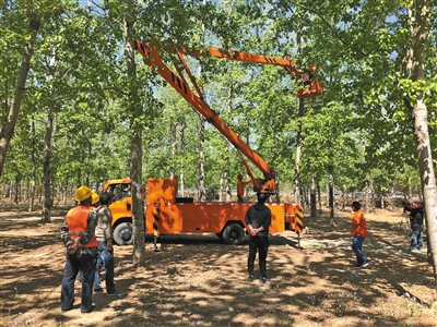 園林工人在修剪高處的楊樹(shù)枝條。新京報(bào)記者 周依 攝