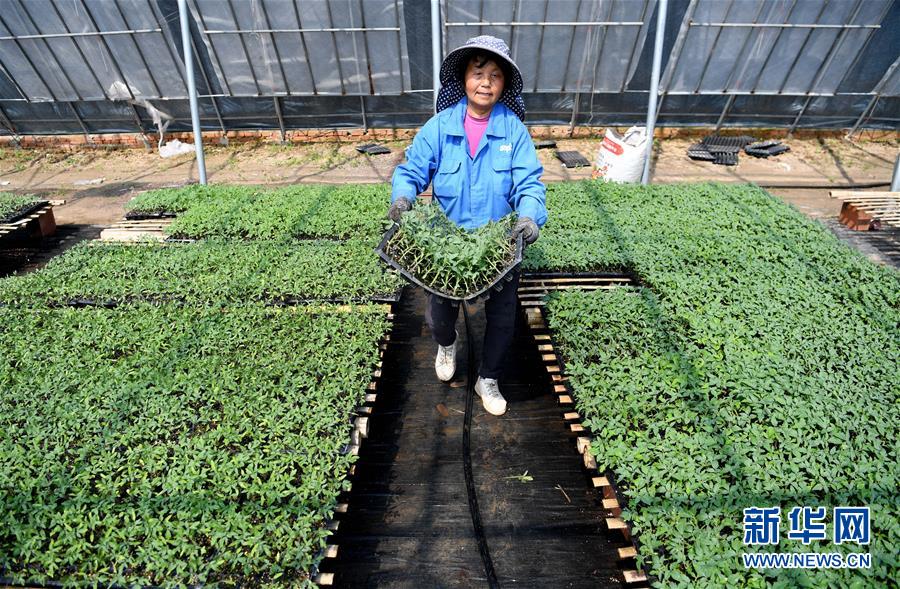 村民在扶貧大棚內(nèi)搬運培育的西紅柿幼苗