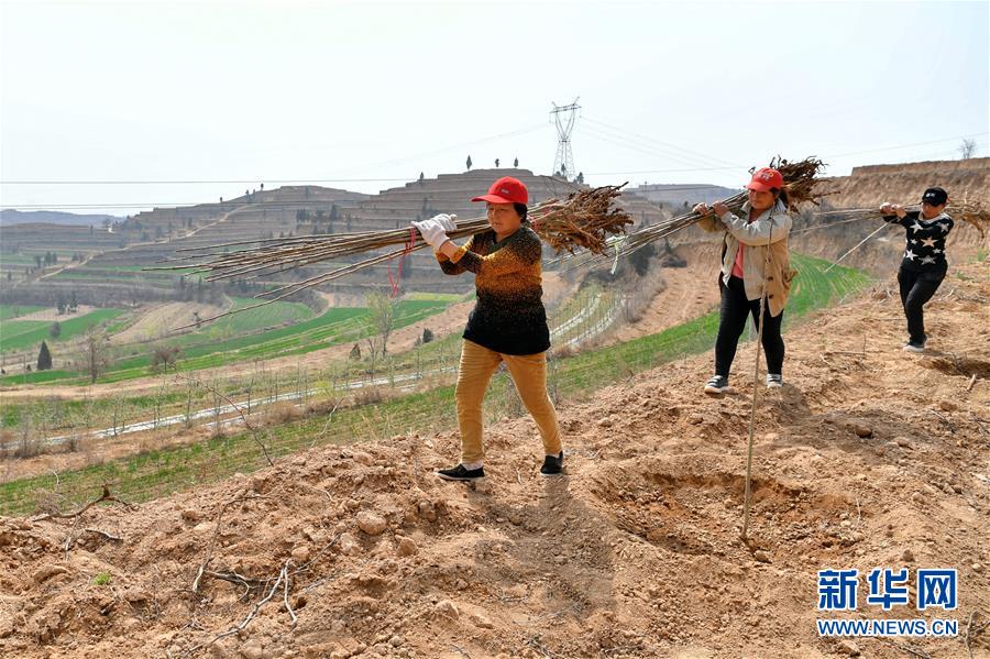 村民們在運送樹苗