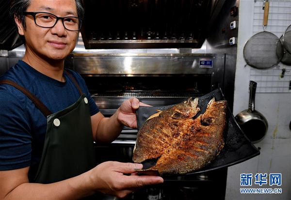 臺(tái)北市“一品言”餐館老板兼大廚劉添吉在展示烤魚(4月24日攝)。新華社記者 張國(guó)俊 攝